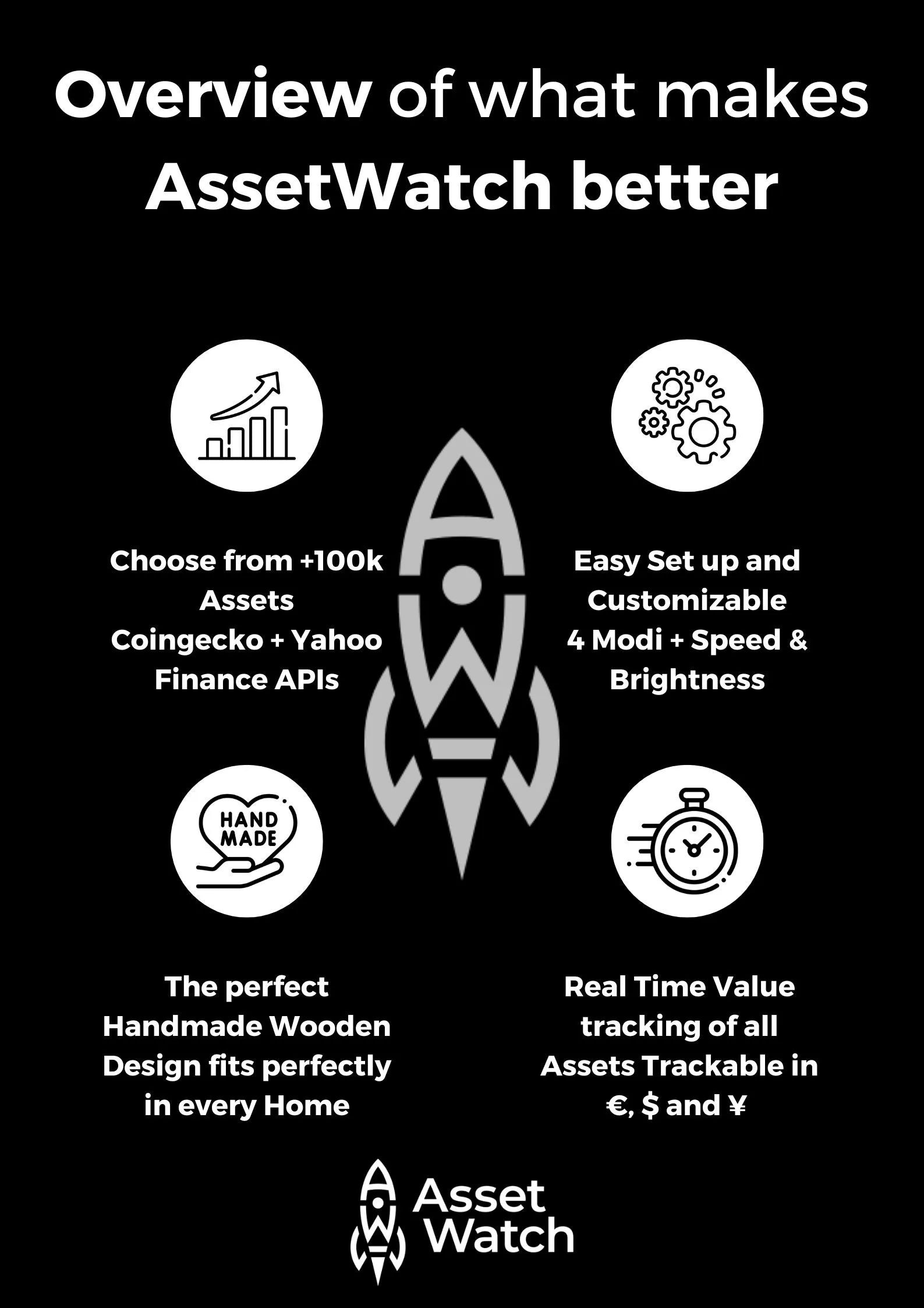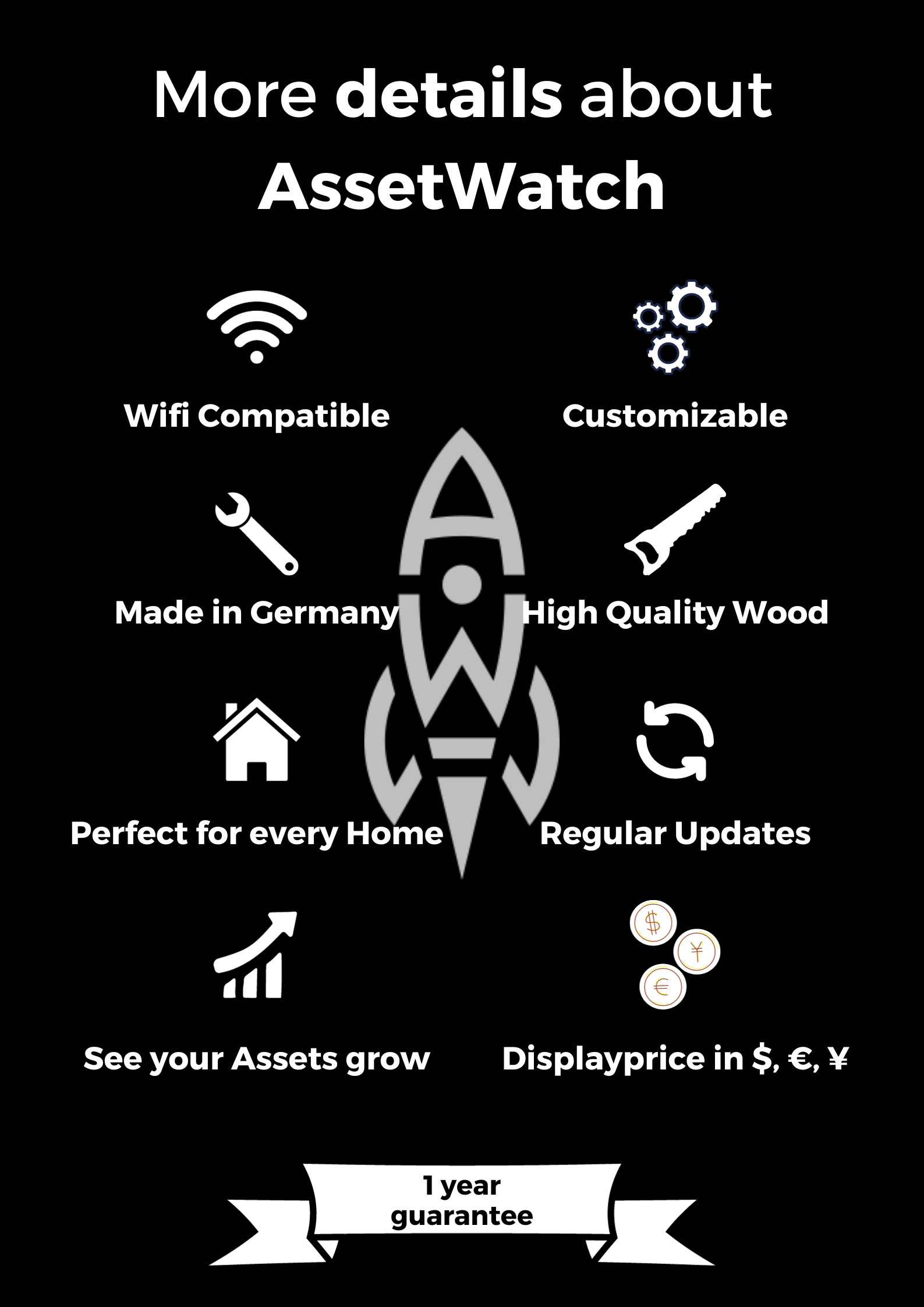 The AssetWatch allows you to easily track all your favorite assets ensuring that you stay ahead of the curve and never miss out on a market trend again. Handcrafted with the best wood in germany we have created a luxurious smart home device, that'll last for years to come.